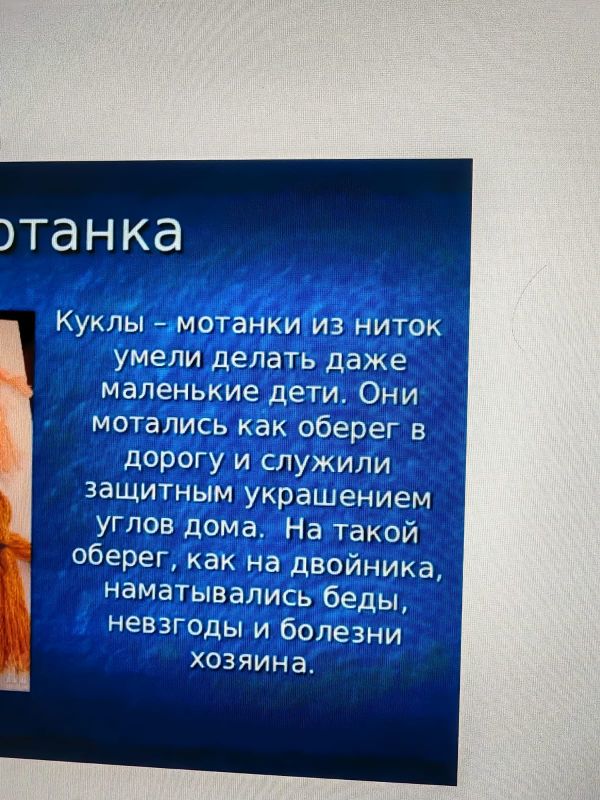 В ходе мастер-класса, Светлана Николаевна, рассказала участникам мероприятия об истории создания куклы-мотанки, о технике изготовления и о материалах, используемых для изготовления тряпичной куклы в разных уголках нашей страны.