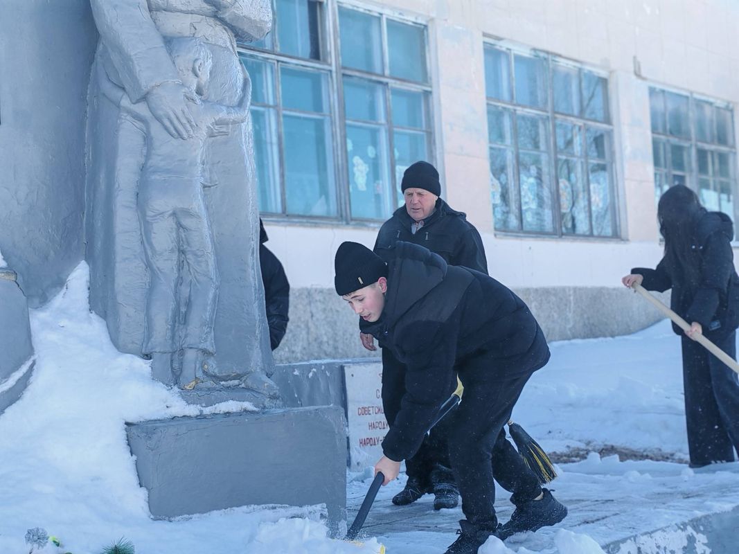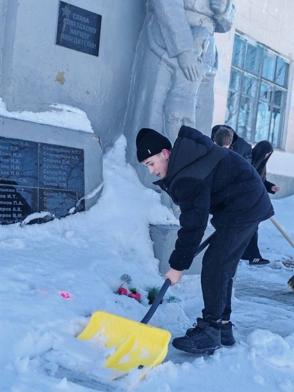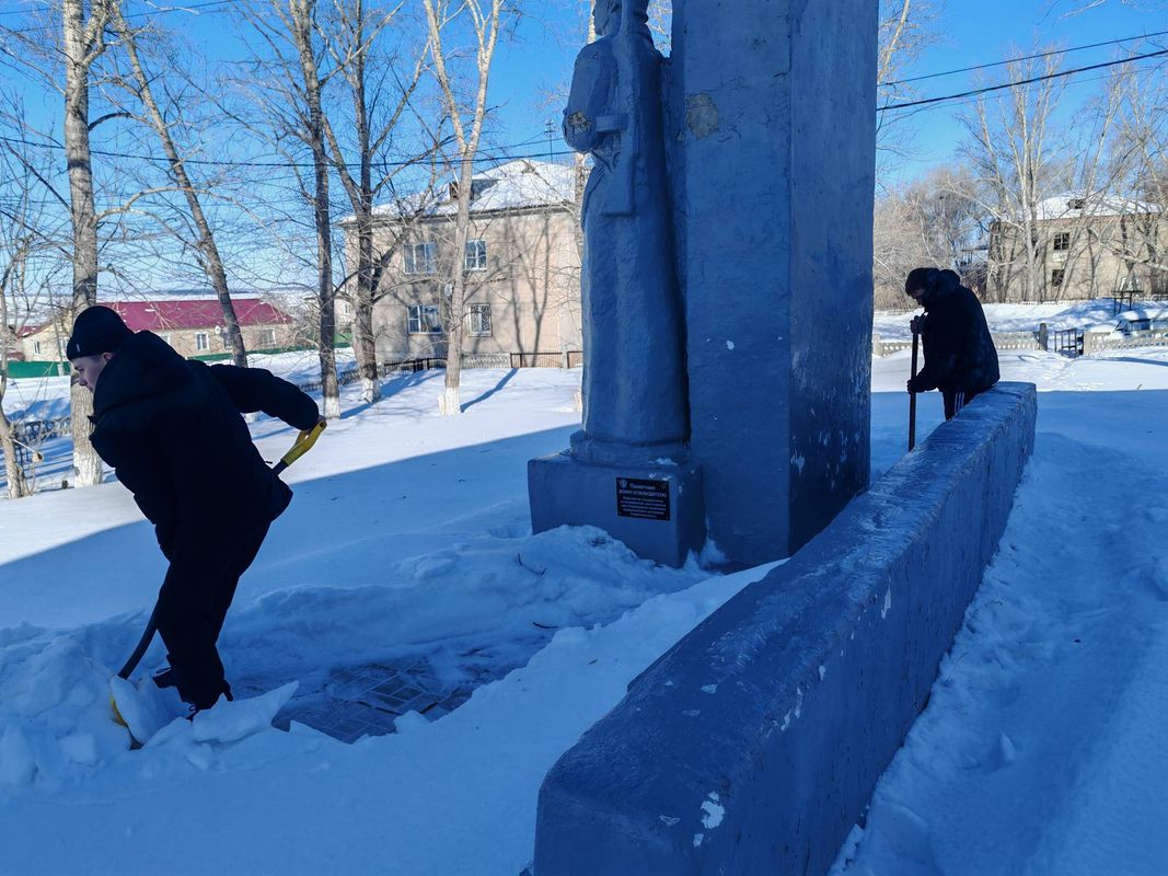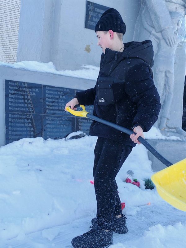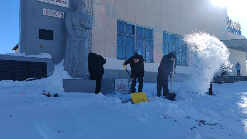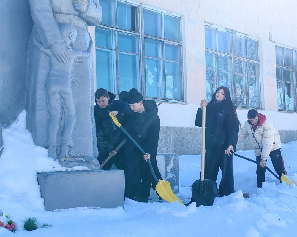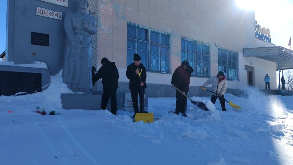 С упорством и самоотдачей ребята расчистили снег у подножия памятника, открыв доступ к нему. Теперь дорожки снова видны, а венки и цветы освобождены из снежного плена.