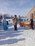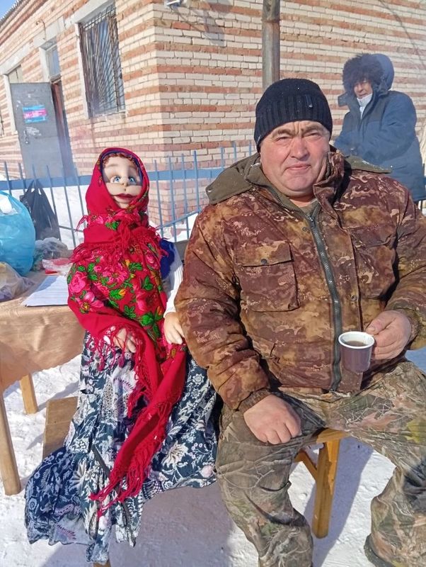 Сельчан встречала госпожа Масленица в русском народном костюме.